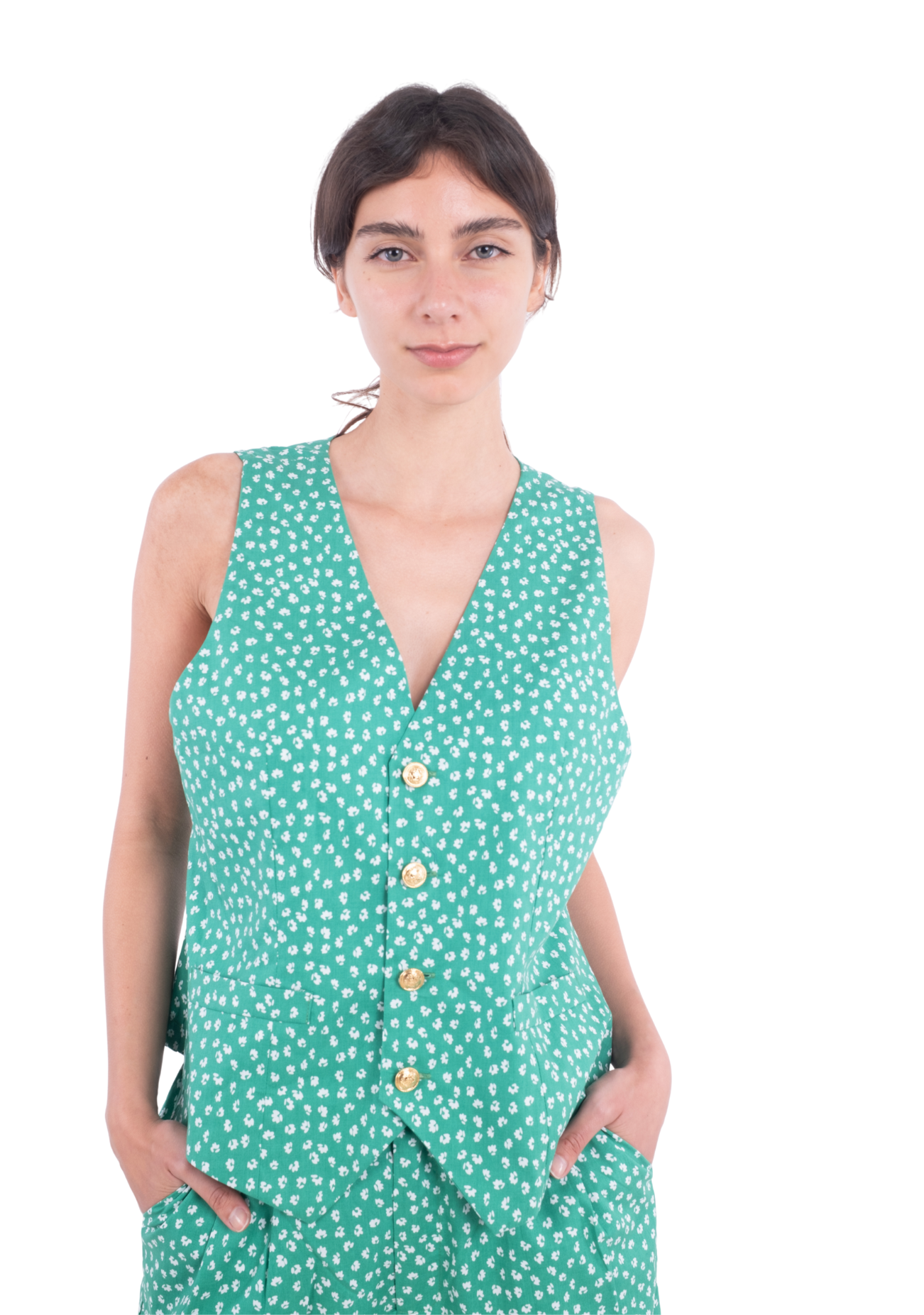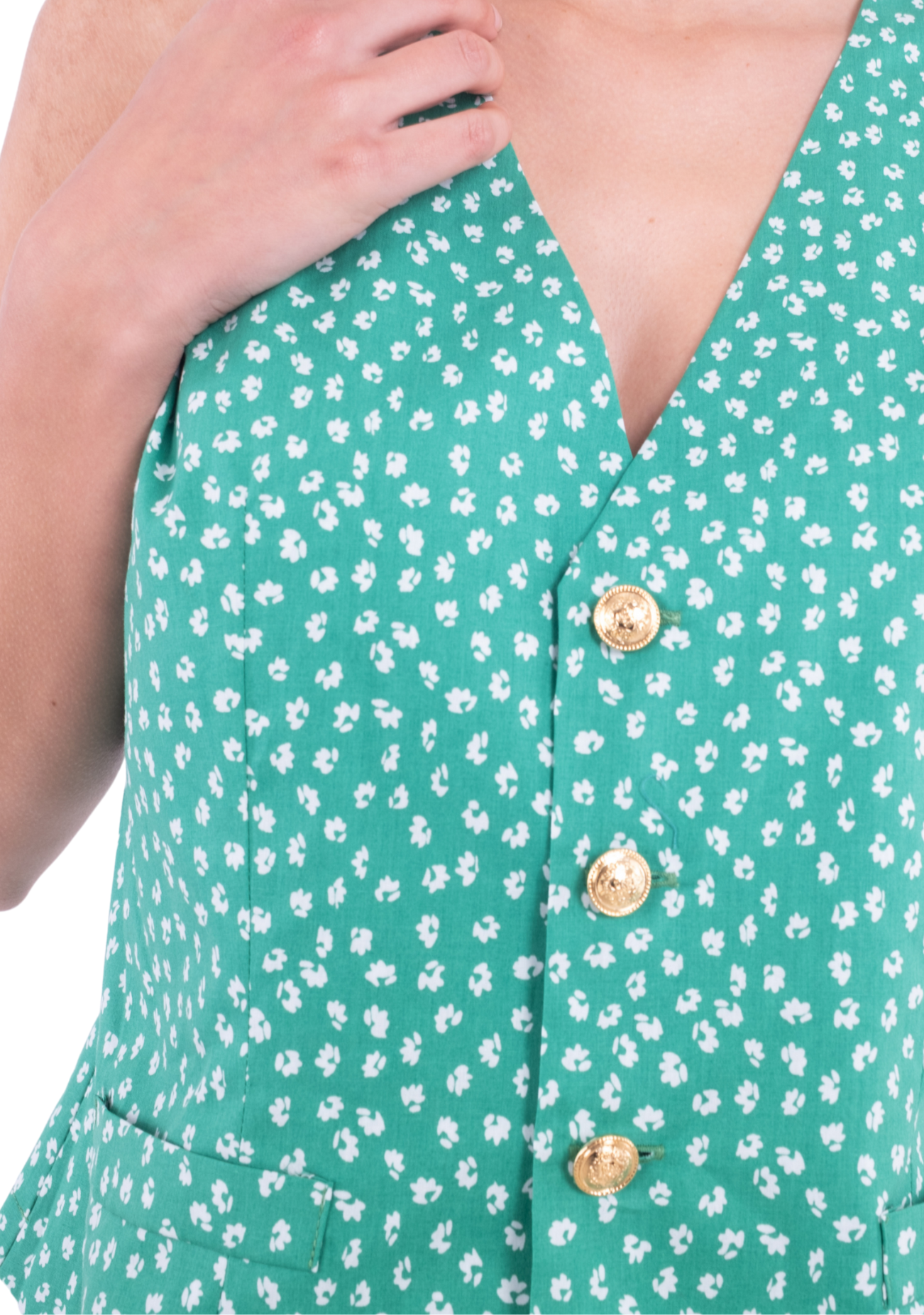 Descubre Marquese, un sofisticado traje estampado que combina un chaleco tipo vest y un short con pinzas, diseñado para quienes buscan estilo y comodidad en los días de verano.